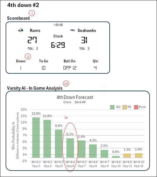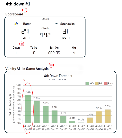 Scoreboard (i): Q4 9:42 | 4th & 1 Ball on SEA 26 | Rams trailing 27-31
