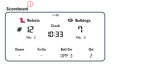 Scoreboard (i): Q2  10:33  |  Ole Miss leading by 5 (12-7)