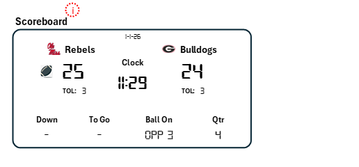 Scoreboard (i): Q4  11:29  |  Ole Miss leading by 1 (25-24)